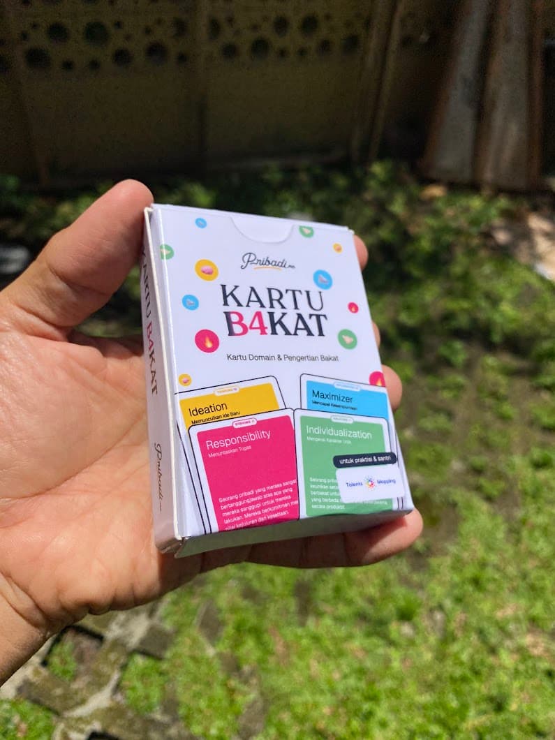 KARTU B4KAT dirancang untuk membantu praktisi/santri Talents Mapping® dan pengguna pribadi dapat eksplorasi potensi diri, menggali dan memahami 34 bakat unik secara menyenangkan dan visual. Setiap kartu menggunakan skema warna yang spesifik untuk menggambarkan empat domain bakat: merah untuk Striving, kuning untuk Thinking, hijau untuk Relating, biru untuk Influencing.