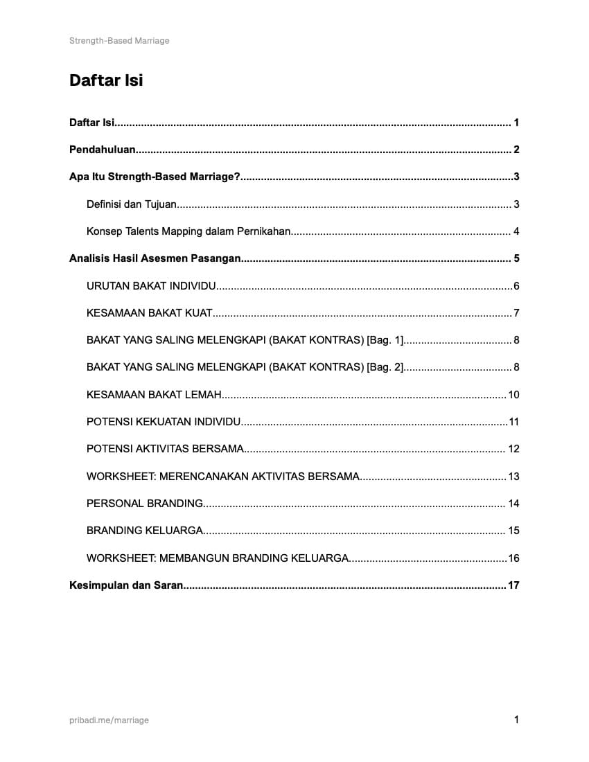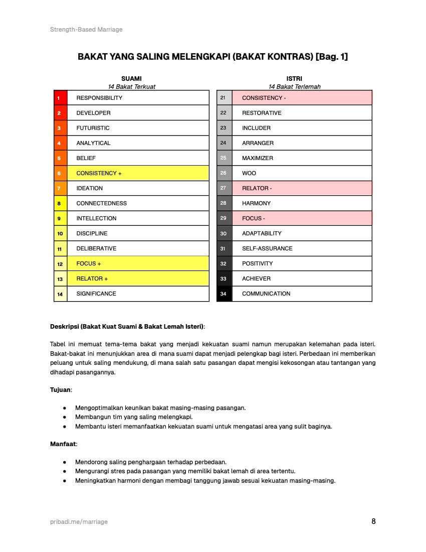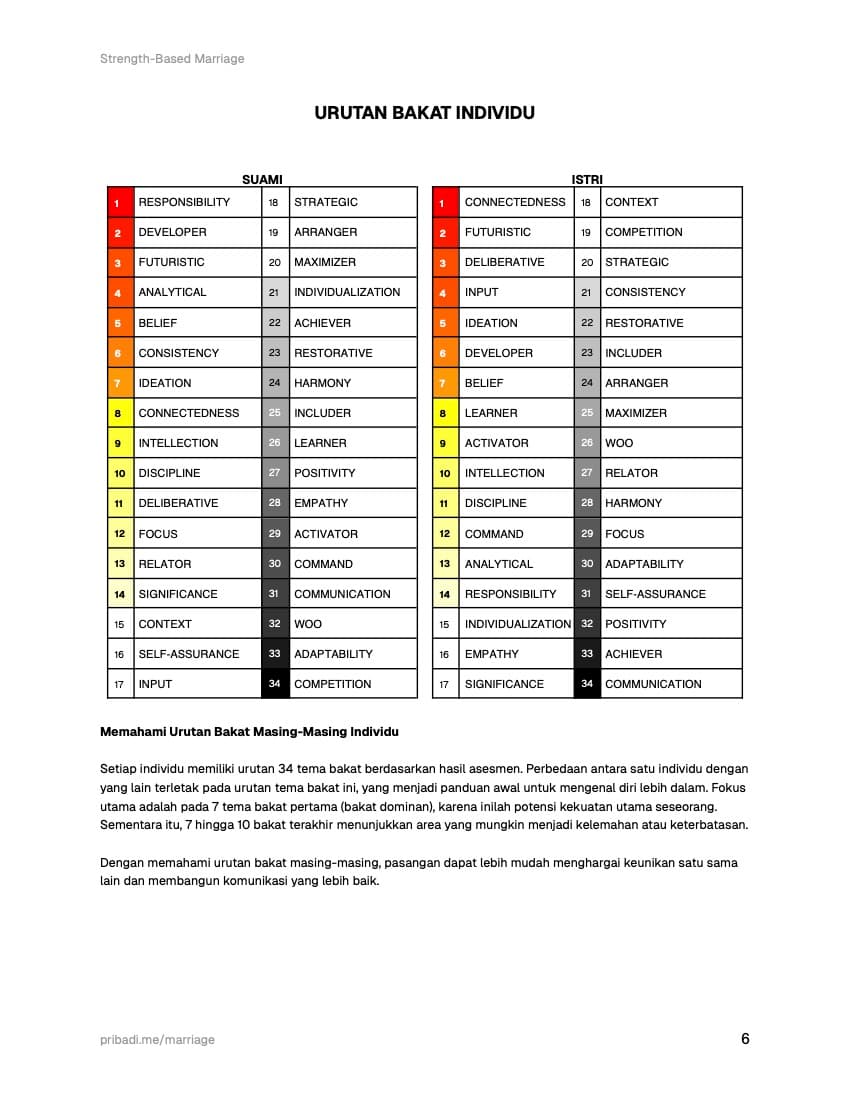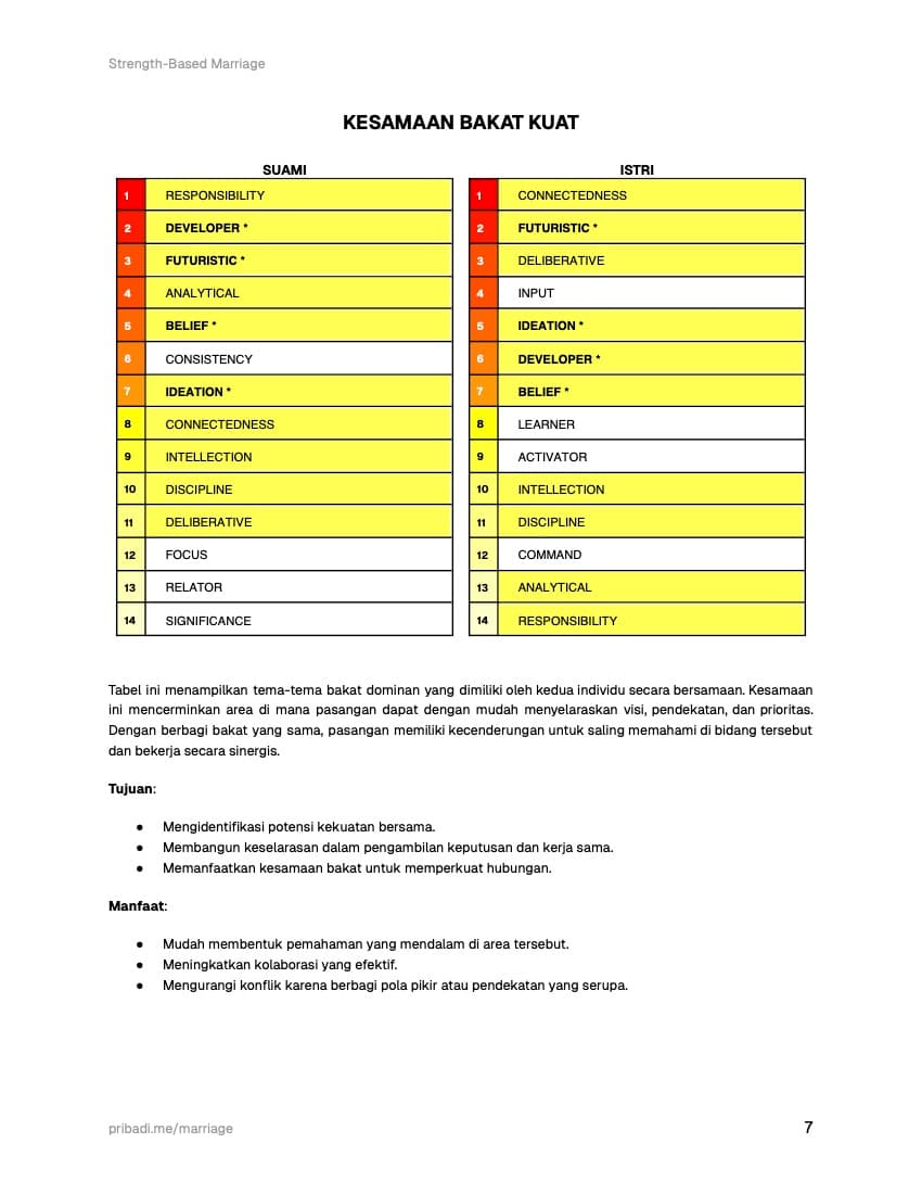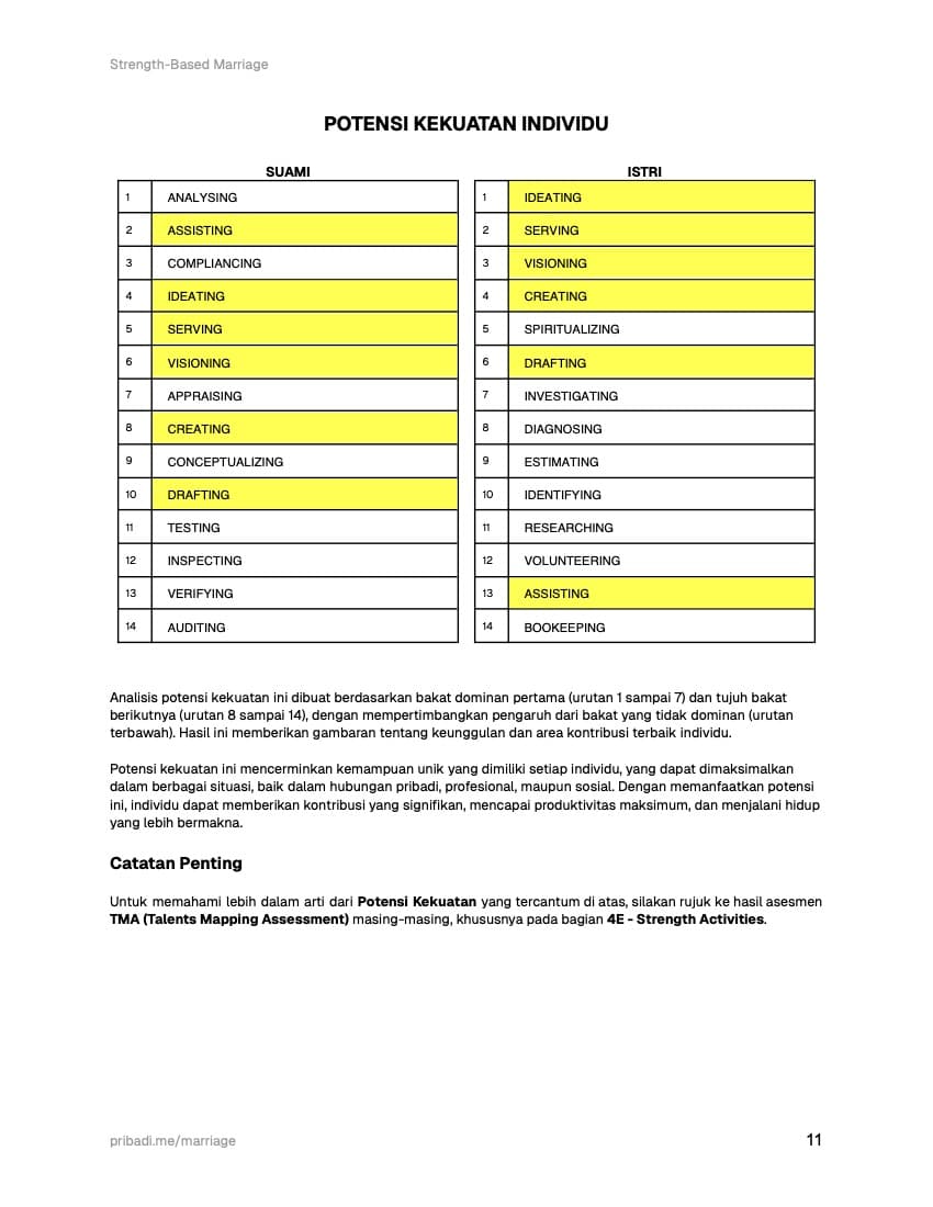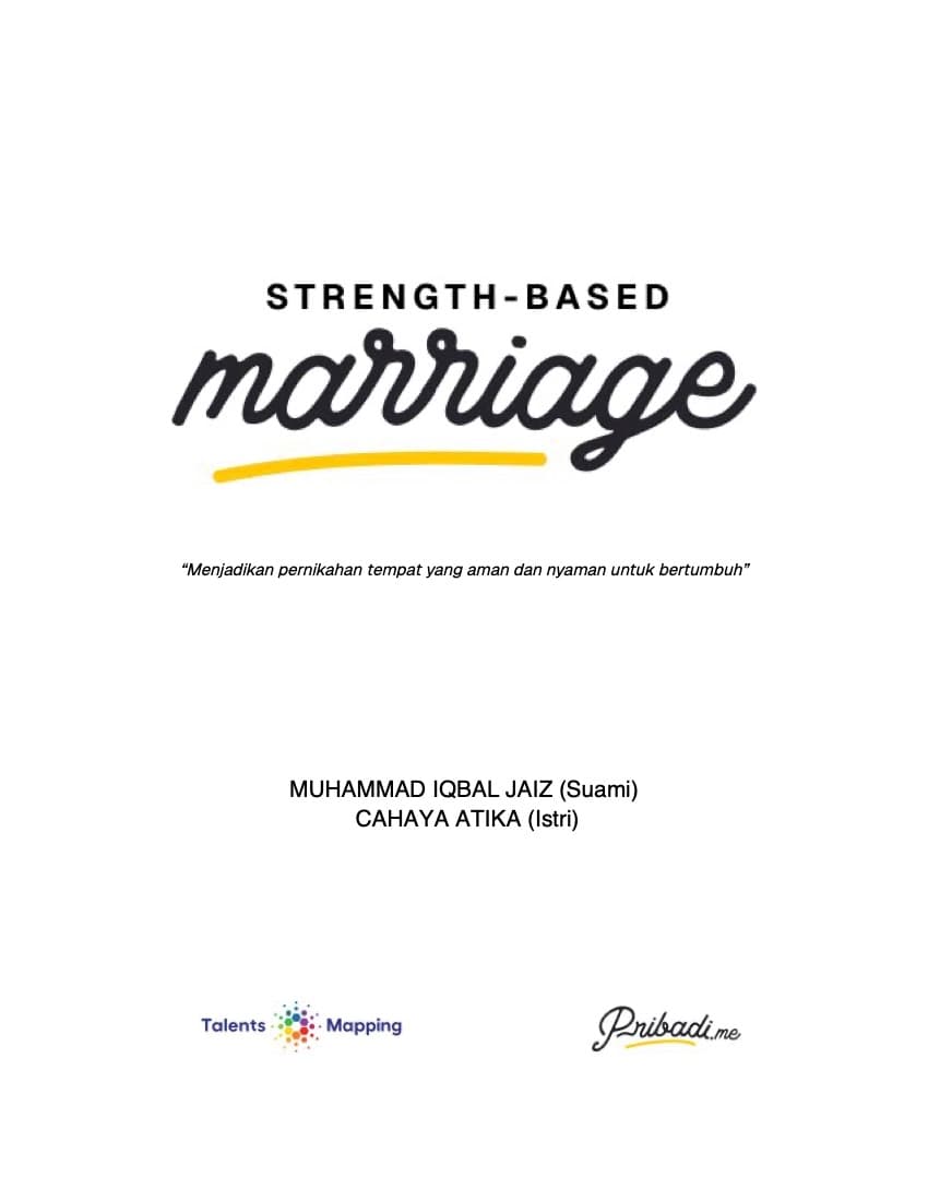 Strengths-Based Marriage (SBM) Report adalah sebuah laporan yang memanfaatkan hasil Talents Mapping® untuk mengoptimalkan keharmonisan dan sinergi dalam pernikahan. Dengan mengidentifikasi dan memadukan bakat unik setiap pasangan, laporan ini juga dirancang untuk memudahkan pengguna membandingkan dua hasil Talents Mapping® Assessment (TMA) pasangan suami istri. Ini memungkinkan pemahaman yang lebih dalam tentang bagaimana bakat individu masing-masing dapat bersinergi atau memerlukan penyesuaian untuk mendukung dinamika pernikahan yang sehat dan harmonis.